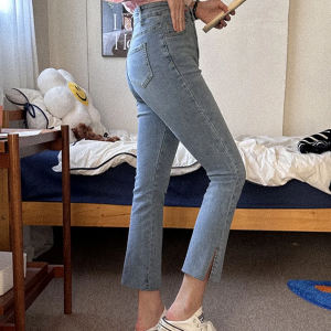 Женские джинсы с высокой посадкой, разрезами по низу и супероблегающим кроем
