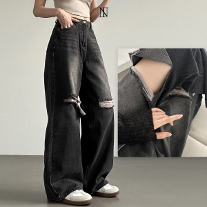 Женские wide-fit джинсы с высокой талией, винтажной варкой и разрезами на коленях