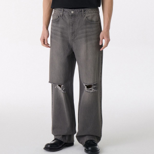 Distressed Knee Wide Denim Pants [Gray]