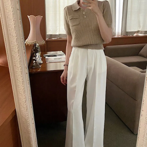 Крой прямой или слегка зауженный книзу, с акцентными пинтак-защипами спереди