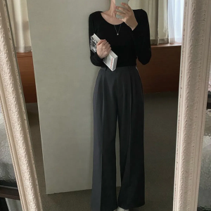 Крой прямой или слегка зауженный книзу, с акцентными пинтак-защипами спереди