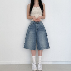 Джинсовые бермуды с широким кроем и накладными карманами в стиле карпентер