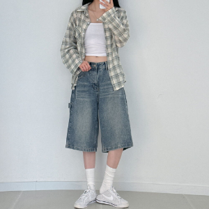 Джинсовые бермуды с широким кроем и накладными карманами в стиле карпентер