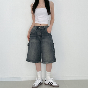 Джинсовые бермуды с широким кроем и накладными карманами в стиле карпентер