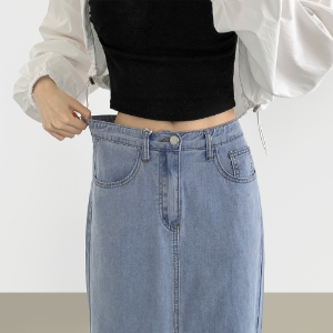 • Летняя джинсовая юбка H-силуэта из тенсела с разрезом сзади и стрейчем по всей длине