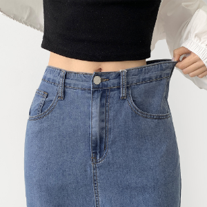 • Летняя джинсовая юбка H-силуэта из тенсела с разрезом сзади и стрейчем по всей длине