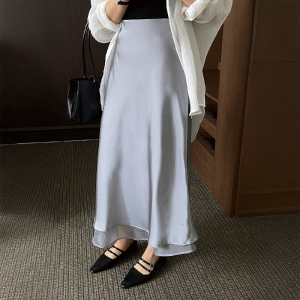 • Длинная атласная юбка с полупрозрачным верхним слоем и эластичным поясом