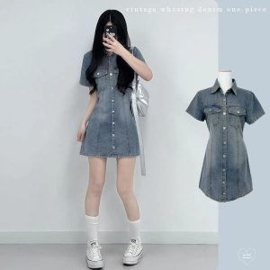 Мини-платье-рубашка из светлого денима с короткими рукавами и бантом на талии