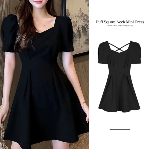 Чёрное мини-платье с открытой спиной и рукавами-пуфами