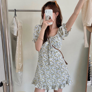 Цветочное летнее мини-платье с подчёркнутой талией и пышными рукавами