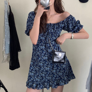 Цветочное летнее мини-платье с подчёркнутой талией и пышными рукавами
