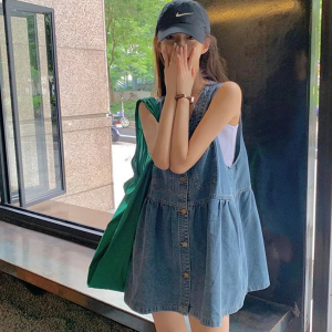 Мини-платье из денима без рукавов с V-образным вырезом и эффектом многослойности