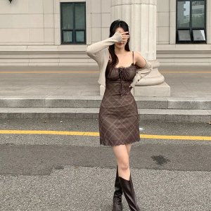 Клетчатое мини-платье с кружевом и приталенной шнуровкой