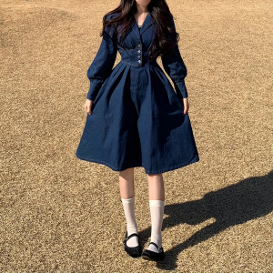 Джинсовое миди-платье с подчёркнутой талией и двойным воротником