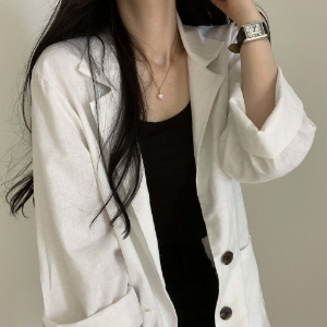 Дизайн минималистичный, с классическим отложным воротником, однобортной застёжкой и прямыми рукавами