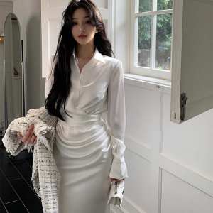 Атласное белое платье-рубашка с запахом