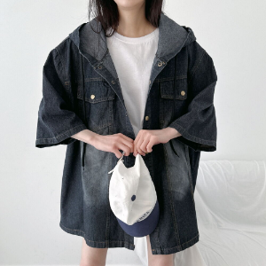 Unisex Oversized Out-Pocket Short-Sleeve Denim Hoodie Jacket
