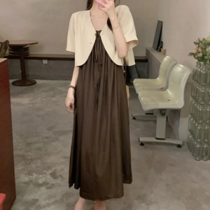 платье — свободное, с тонкими бретелями; жакет — свободный с короткими рукавами