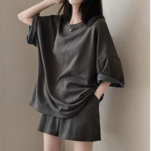 Крой футболка — свободная, с классическим круглым вырезом; шорты — укороченные, с эластичным поясом