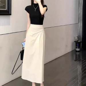 Крой футболка — приталенная с короткими рукавами и высоким воротником; юбка — длинная, с запахом и поясом