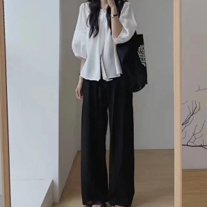блузка— свободная и удлинённая; брюки — прямого кроя, со шнурком на талии