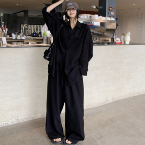 Крой рубашка — оверсайз с прямыми рукавами и свободной линией плеч; брюки — широкие, с прямыми штанинами и комфортной посадкой