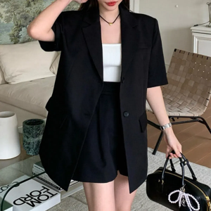 жакет — полуприталенный, с классическим воротником и длинными рукавами; бермуды — свободные, длиной чуть ниже колена, с высокой талией и регулируемым поясом
