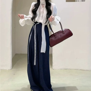 • Элегантный комплект: шифоновая блузка с V-образным вырезом и широкие брюки с кружевной отделкой