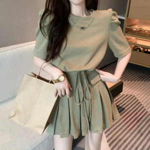 Крой футболка с короткими рукавами и пышной линией плеч, плиссированная мини-юбка с посадкой на талии