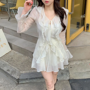 Шифоновая блузка с рюшами и прозрачными рукавами + мини-юбка А-силуэта с поясом на резинке