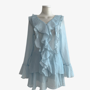 Шифоновая блузка с рюшами и прозрачными рукавами + мини-юбка А-силуэта с поясом на резинке