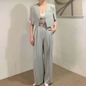 Крой укороченный жакет с короткими рукавами, широкие брюки с высокой посадкой