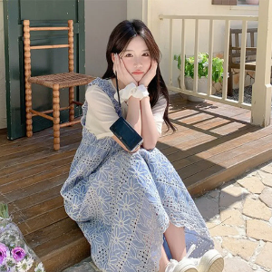 Крой футболка — прямая с короткими рукавами и округлым вырезом; платье — A-силуэт на широких бретелях