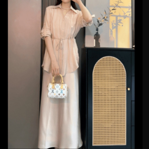 Крой платье — прямой и струящийся; рубашка — свободная с поясом на талии