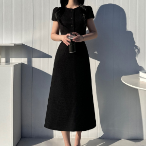 • Костюм-двойка: укороченный твидовый жакет с пышными короткими рукавами и длинная юбка А-силуэта с разрезом сзади