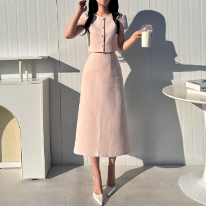 Костюм-двойка: укороченный твидовый жакет с пышными короткими рукавами и длинная юбка А-силуэта с разрезом сзади