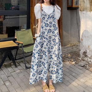Крой свободный топ с округлым вырезом и пышными рукавами в сочетании с комбинезоном на тонких бретелях и V-образным вырезом