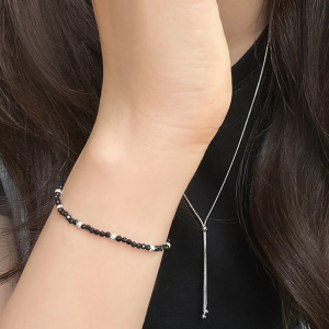 Серебряный браслет с чёрными бусинами на эластичной основе