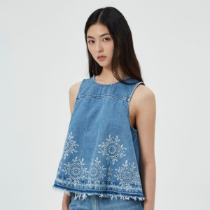 деним нежно-голубого оттенка, романтичный вырез и декоративные акценты