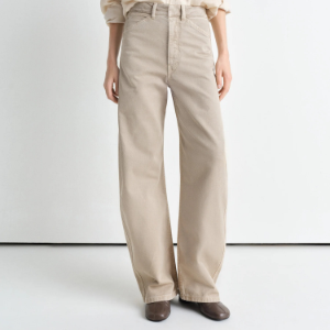 высокая посадка и объёмный, изогнутый крой штанин, сужающихся к низу