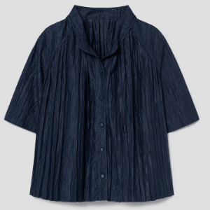 KUHO [Crease Series] Linen Blend Pleats Half-Sleeved Blouse – Navy
