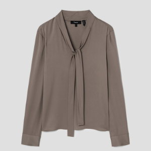Theory Women Silk Georgette Open Neck Tie Blouse — Walnut