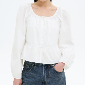 • 8 seconds Cotton Neck Shirring Long Sleeve Blouse — White